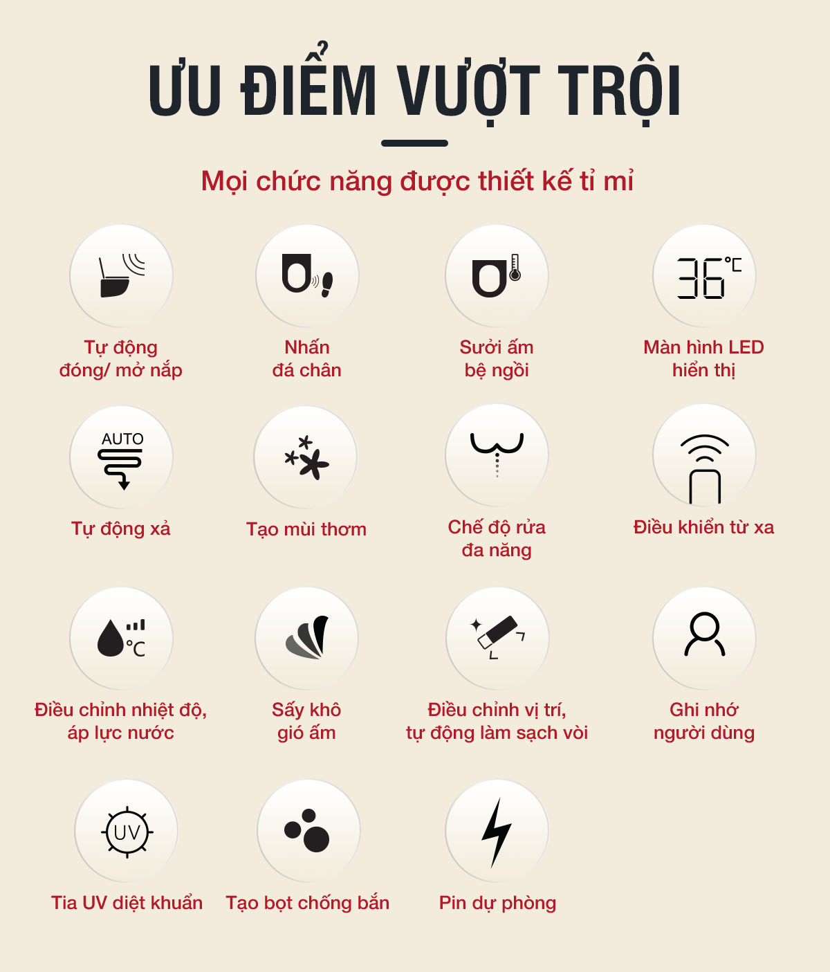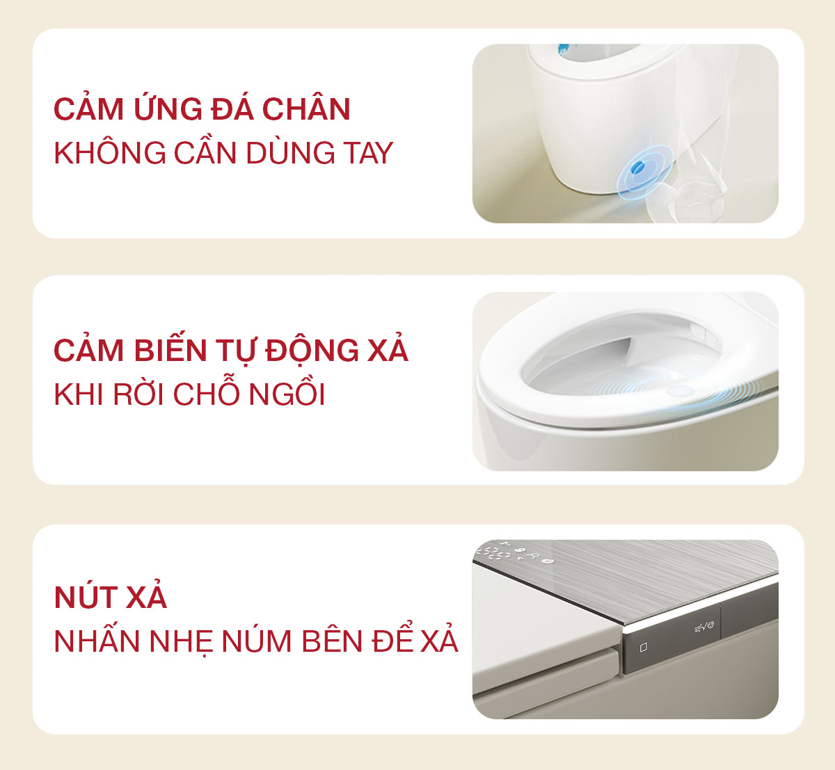 1. Hệ thống cảm ứng đa điểm (Nhận diện, Đá chân): Với bộ ba cảm ứng siêu nhạy, bồn cầu tự động nhận diện người dùng để mở nắp, kích hoạt đèn nền khi trời tối, và cho phép ra lệnh xả hoặc đóng/mở nắp chỉ bằng một cú đá chân tiện lợi. Trải nghiệm hoàn toàn không chạm tay, giúp ngăn ngừa vi khuẩn lây lan qua tiếp xúc.