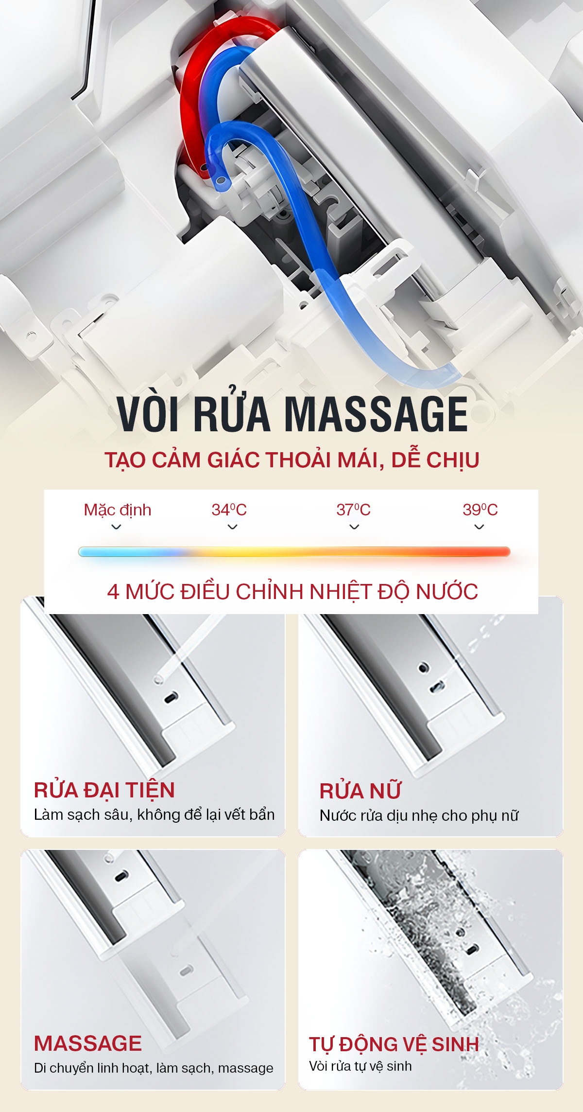 4. Vòi rửa đa chế độ, cá nhân hóa 4 cấp độ: Đáp ứng mọi nhu cầu của các thành viên, bồn cầu cho phép điều chỉnh chính xác vị trí vòi xịt và 4 cấp độ áp lực nước. Các chế độ rửa chuyên biệt như rửa đại tiện, rửa nữ, cùng chức năng massage và hỗ trợ người bệnh táo bón mang đến giải pháp chăm sóc sức khỏe chuyên sâu.