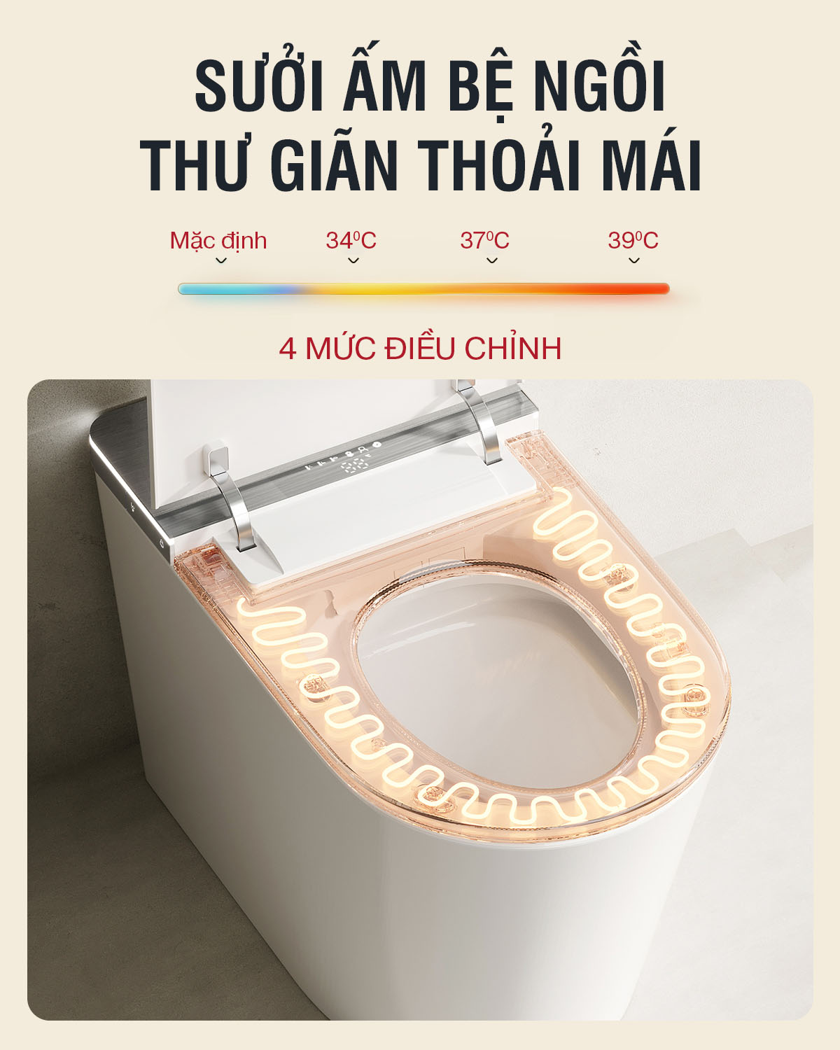 2. Tự động sưởi ấm toàn diện (Bệ ngồi, Nước rửa, Gió sấy): Hệ thống nhiệt kế số tự động kích hoạt chế độ sưởi ấm bệ ngồi, làm ấm nước rửa và luồng gió sấy. Tính năng này xua tan cảm giác lạnh giá, mang lại sự thư giãn, thoải mái tuyệt đối trong mọi điều kiện thời tiết, chăm sóc làn da một cách êm ái.