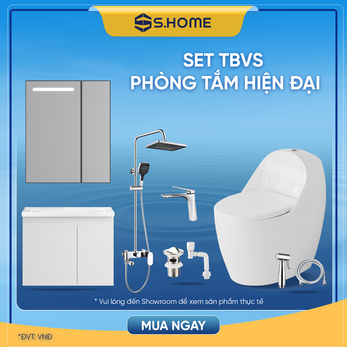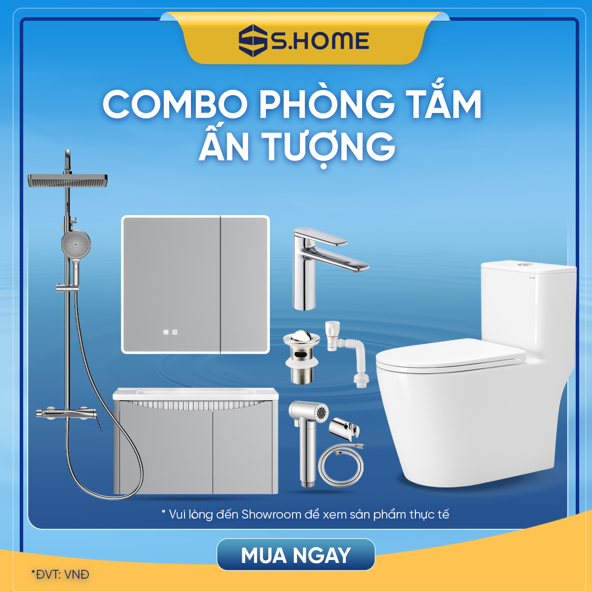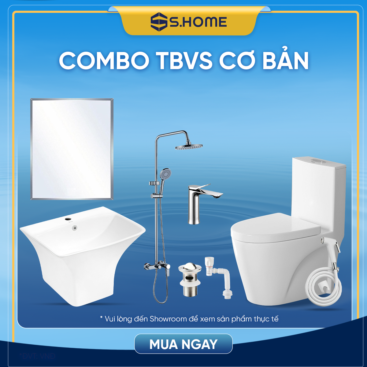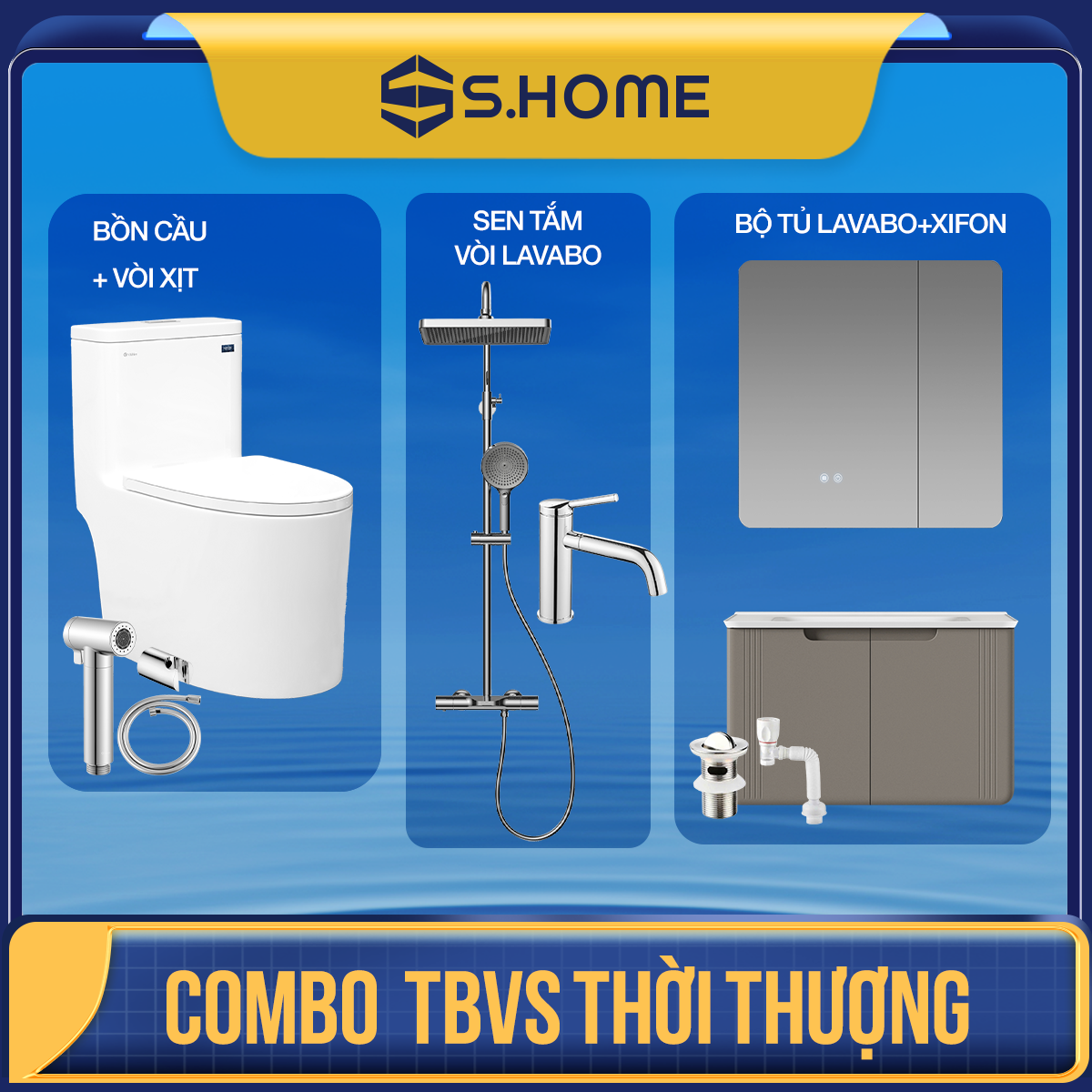Một combo đầy đủ tại S.Home thường bao gồm 5-7 món cốt lõi: Bồn cầu, chậu rửa Lavabo, vòi chậu, sen tắm, vòi xịt vệ sinh, gương phòng tắm và phụ kiện (giá treo khăn, kệ kính).
