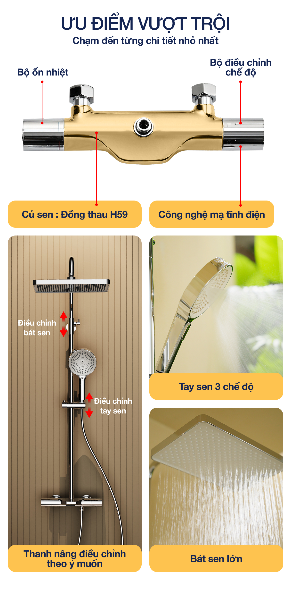 - Trải nghiệm tắm sang trọng: Bát sen trần kích thước lớn cho tia nước đều, tay sen 3 chế độ massage, thư giãn tối đa.