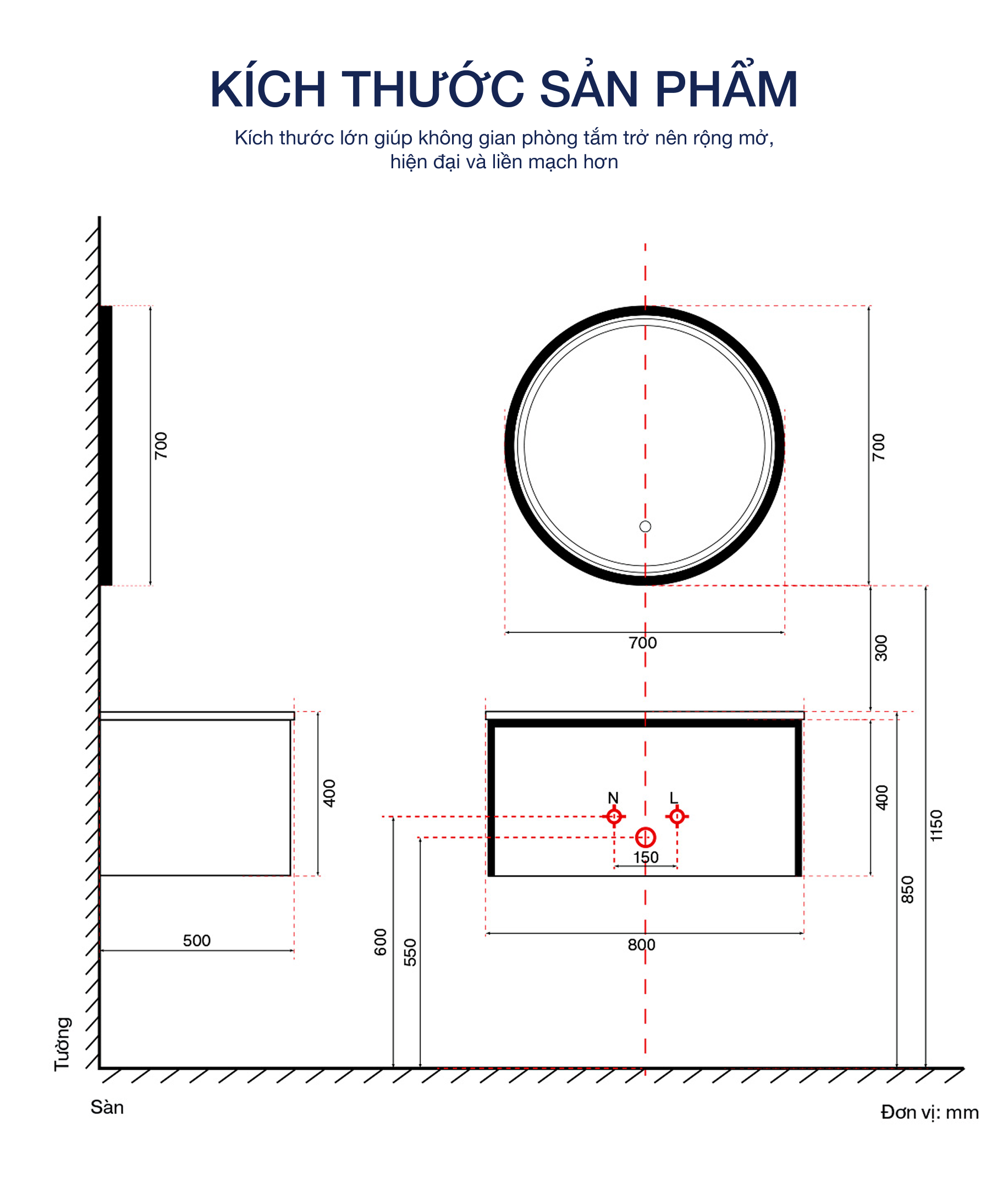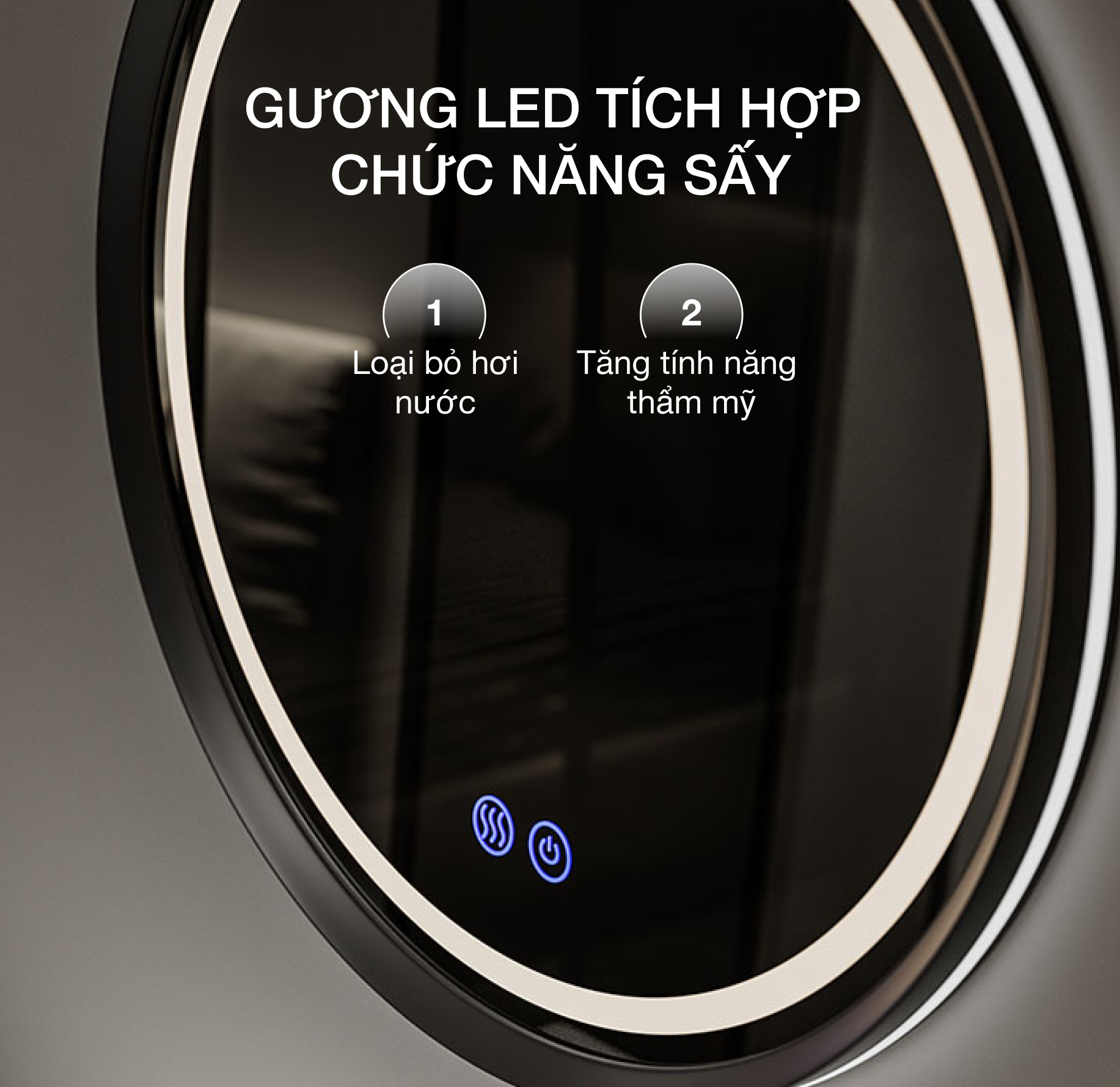 Gương tròn 700mm tích hợp đèn LED + sấy, loại bỏ hơi nước, tăng tính thẩm mỹ.