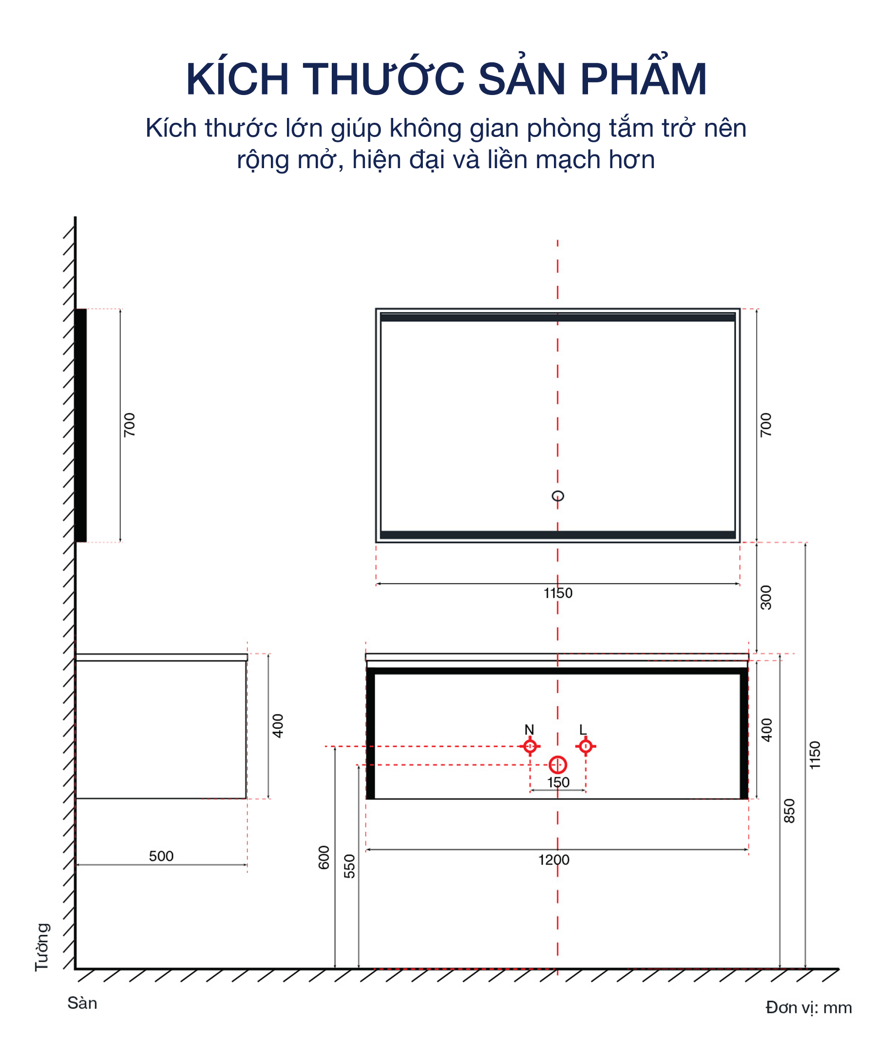 Kích thước 1200 x 500 x 400mm, tối ưu cho phòng tắm rộng.
