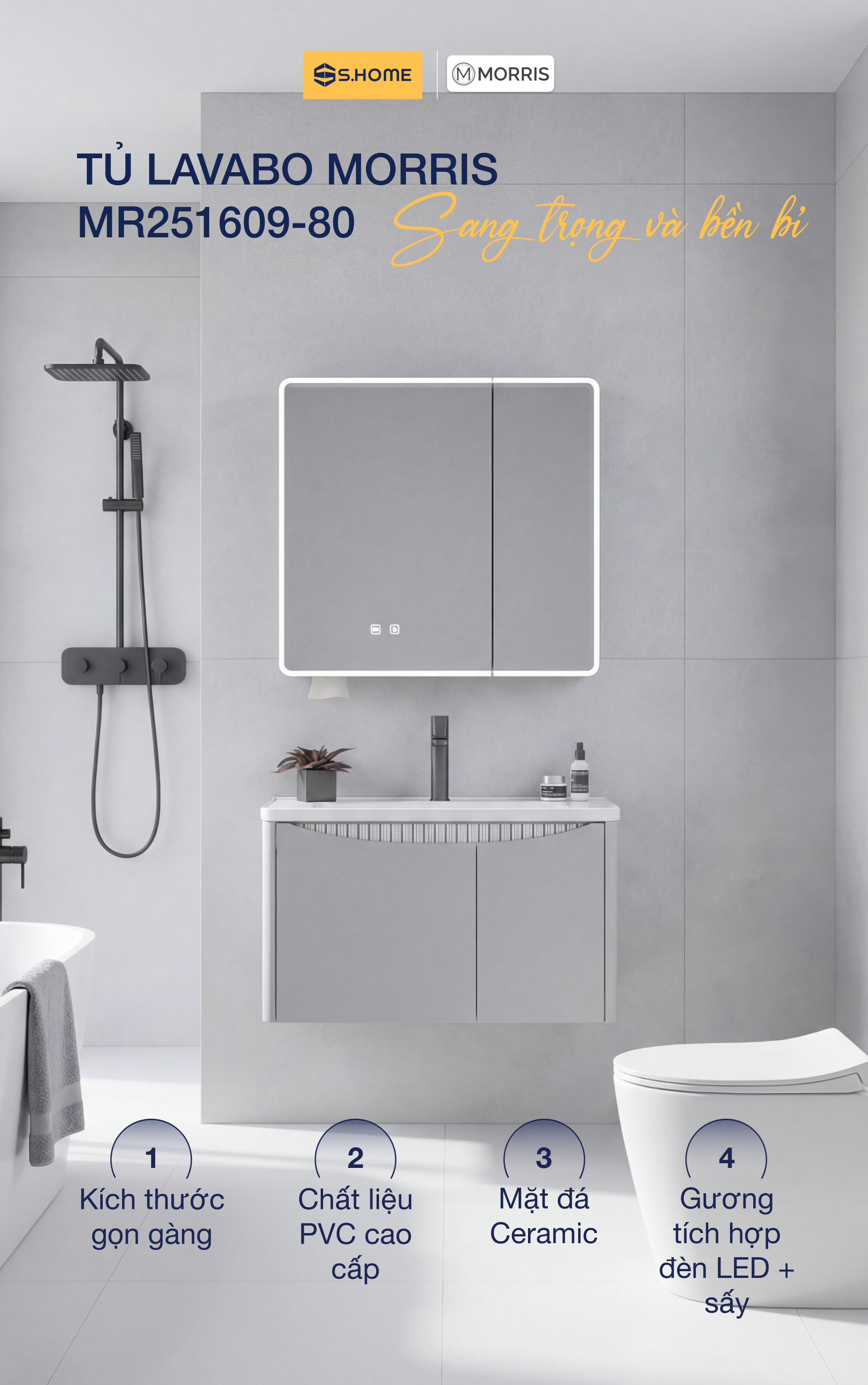 S.Home tự hào là hệ thống Nhà bếp & Phòng tắm hàng đầu Việt Nam phân phối chính hãng sản phẩm Tủ lavabo kèm tủ gương Morris MR251609-80 với chính sách bảo hành minh bạch và uy tín.