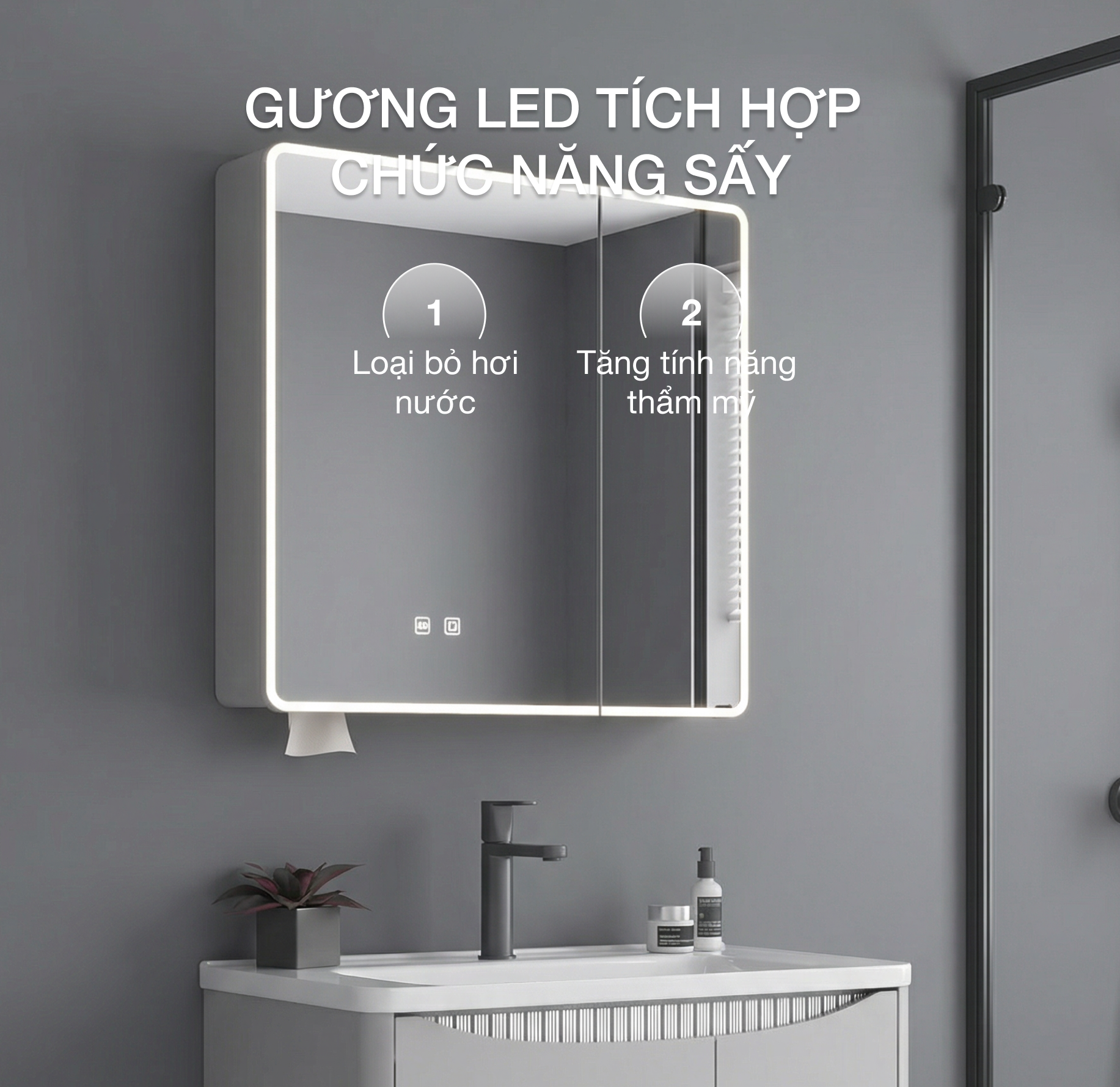 - Gương LED tích hợp sấy, chống mờ khi tắm nóng – tiện lợi cho mọi thời điểm sử dụng